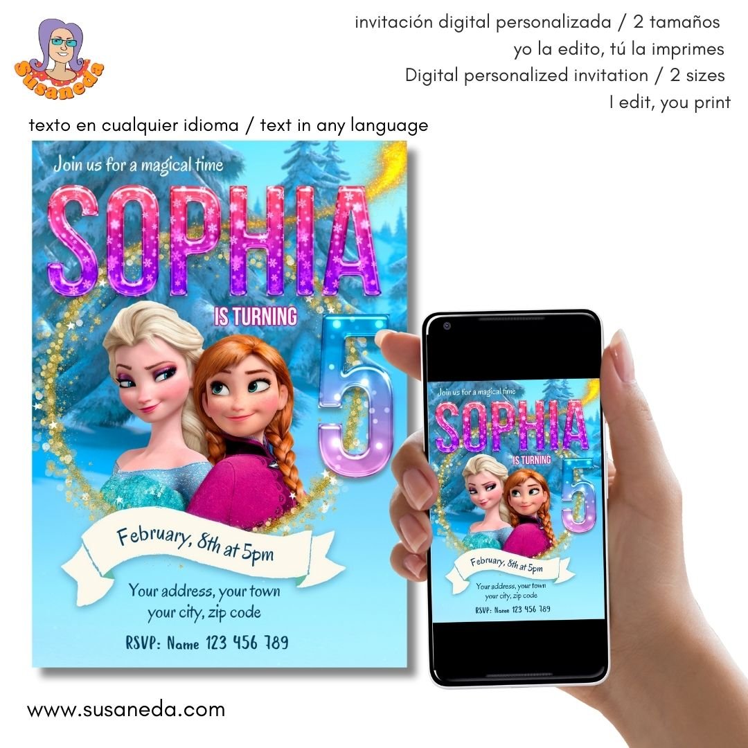 Invitación Frozen digital personalizada, en dos tamaños, uno para imprimir y otro para enviar por Whatsapp o email.