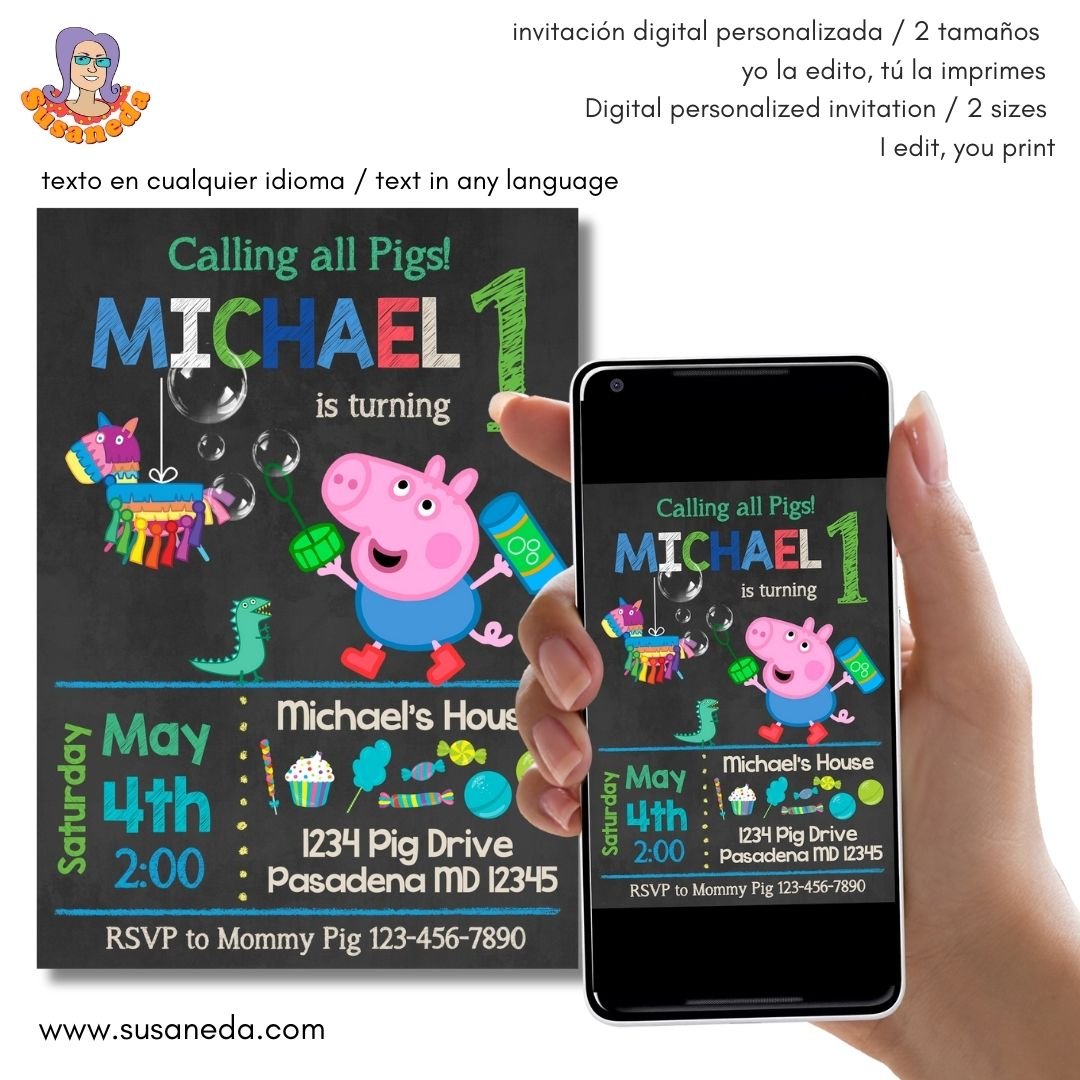 Invitación digital de Peppa Pig Pirata con la foto que quieras y con textos personalizados, en dos tamaños, uno para imprimir y otro para enviar por Whatsapp o email.